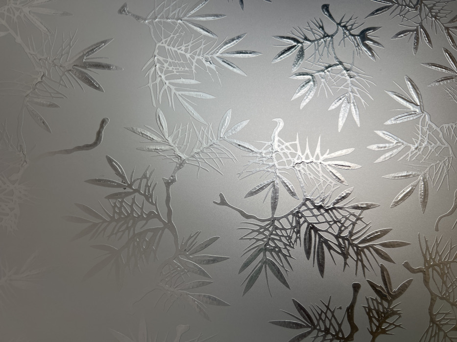The image displays a detailed, monochromatic pattern on a light grey, semi-transparent or frosted surface, likely glass or a similar translucent material