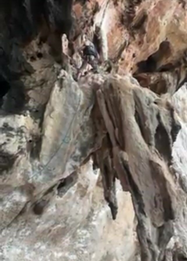 A rock climber is scaling a cliff face in what appears to be a cave or overhang