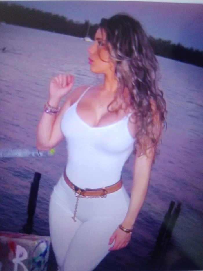 A woman in a white tank top and tight white pants with a brown belt poses outdoors. She has long, curly hair and is looking to her left. The background features a body of water, likely a lake or ocean, and some trees in the distance. The overall lighting is soft. She wears bracelets on both wrists and stands near a graffiti-covered concrete structure.