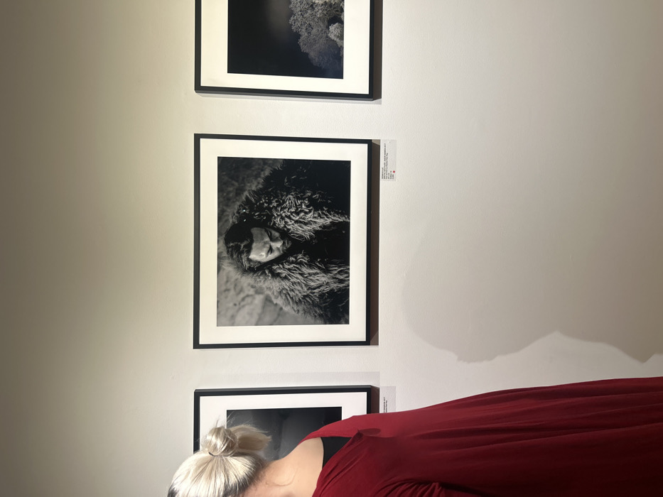 A vertical image features three framed, black and white photographs displayed on a light gray wall. A woman with blonde hair in a bun, wearing a red top, is partially visible at the bottom of the frame. The middle photograph appears to depict a person covered in fur or heavy clothing. The top photograph shows a dark, textured landscape, possibly trees. The bottom photograph's content is not fully discernible due to the woman obstructing part of it.