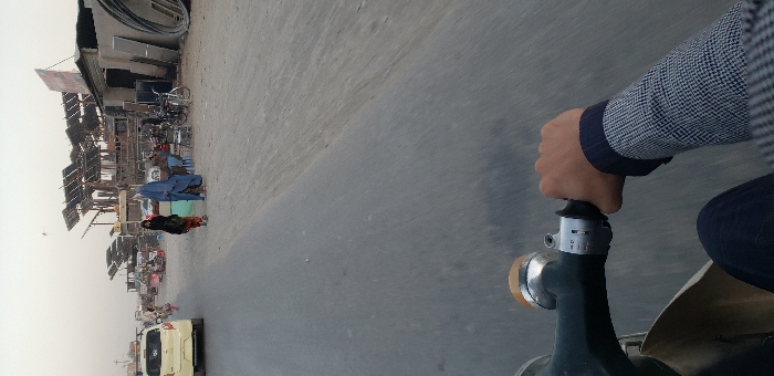 This image presents a street scene from the perspective of a person operating a moving scooter in Kandahar, Afghanistan