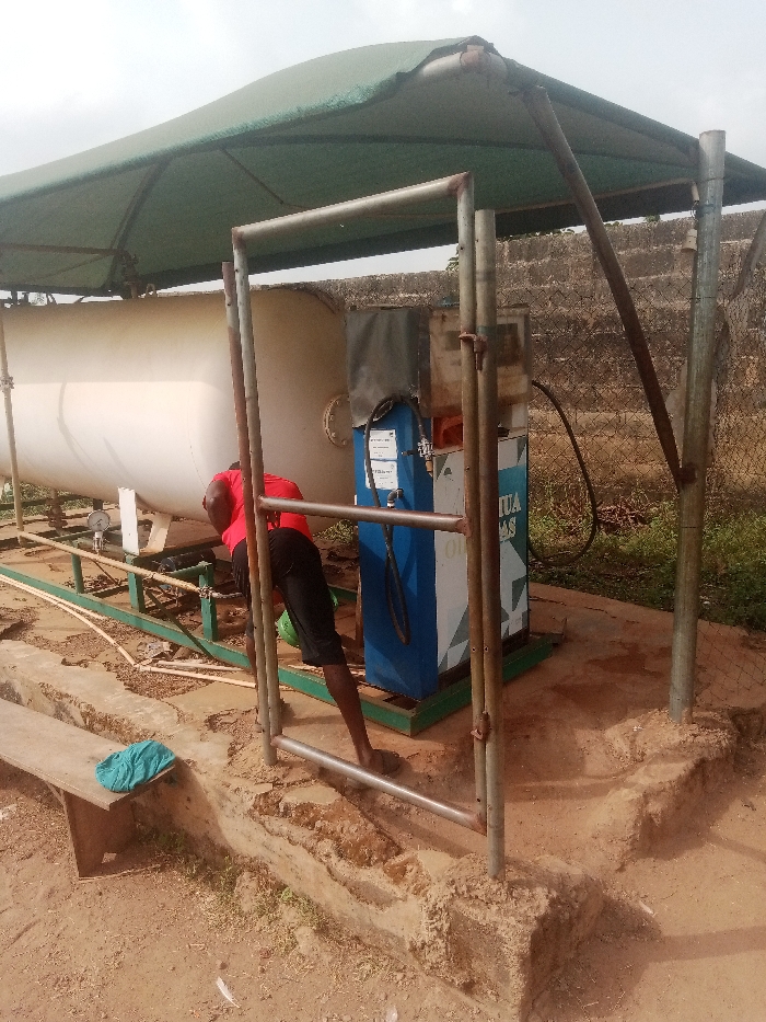 The scene depicts an outdoor gas dispensing station located in Ajibade, Nigeria