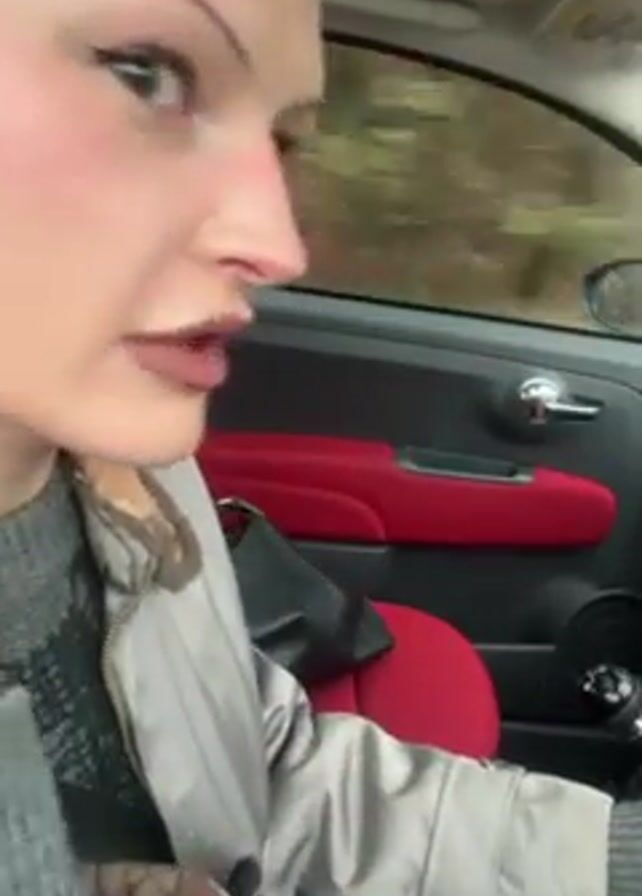 A pale woman is driving a car. She glances at the camera and asks what the most "cultural moment of 2025" is. The interior of the car is visible, with red accents on the door and seat. The surroundings are blurry, suggesting movement. The woman has fair skin, light makeup, and wears a gray jacket over a dark top. She gestures with her hand as she speaks.