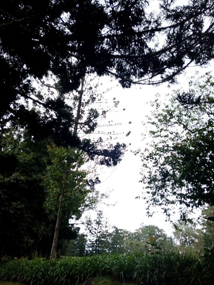 A natural setting presents lush vegetation with a variety of trees, plants, and shrubs. Dark, shadowy branches form an upper frame, contrasting with the lighter sky peeking through the foliage. A blend of dark green foliage juxtaposes against the brighter greens in the undergrowth. A sense of depth is achieved with smaller trees in the background, creating a layered, natural composition.