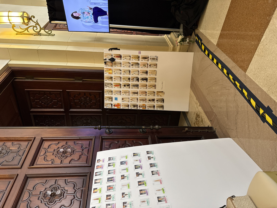 A large, ornately carved wooden door is flanked by two posters displaying a grid of small pictures