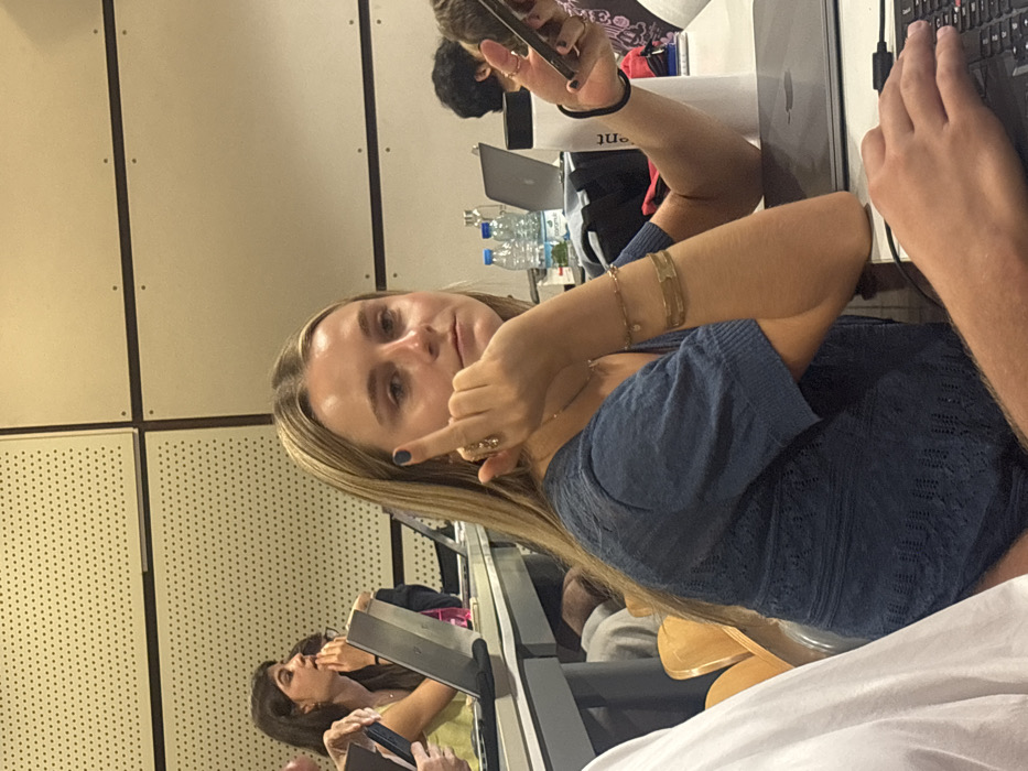 The image depicts an indoor scene within a university classroom or lecture hall, specifically located at NOVA SBE in Carcavelos, Oeiras, Portugal. The central subject is a young, fair-skinned woman with long blonde hair, wearing a blue, short-sleeved, patterned top. She is seated at a white desk, looking directly at the camera with a neutral expression. Her left hand is raised, with the middle finger extended upwards; her fingernails are painted dark. Her right hand holds a black smartphone. On her right wrist, she wears multiple bracelets, including a thin chain and a gold-toned cuff. To her right on the desk, a black laptop is open, and a white cylindrical container with "rent" partially visible is present. In the immediate foreground, the left arm and hand of another individual, wearing a white shirt, are visible operating a keyboard. In the background, to the left, a second young woman with dark hair is seated at a similar desk with an open silver laptop, looking towards the right side of the frame. The walls are composed of light-colored, perforated acoustic panels. Other students are partially visible in the background, and additional plastic water bottles are present on desks. The scene suggests an academic setting during a class or study period.