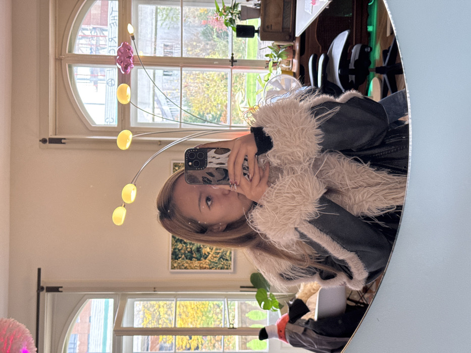 A person is observed taking a mirror selfie indoors, in a residential or office setting located in Wallisellen, Switzerland. The individual, possessing light brown hair and subtle white adornments on the right side of their face, holds a silver iPhone featuring a black and white patterned case, obscuring the majority of their face. They are dressed in a black jacket with prominent light beige/pinkish faux fur trim on the collar and cuffs, worn over a black long-sleeved garment. The reflective surface reveals a room with light-colored walls and two large arched-top windows. Through the windows, an autumnal exterior is visible, characterized by trees displaying yellow and orange foliage, a stone balustrade, and sections of distant buildings. The interior features a modern floor lamp with five flexible arms, four terminating in yellow, spherical lights, and one in a distinct pink, cloud-shaped light. Additional objects within the reflected space include a black office chair, a brown wooden cabinet supporting an antique-style radio and a black speaker, several potted plants, a white oscillating fan, and a partially visible white feathery pendant light fixture. A green ambient light source is present near the floor, and a white chair with draped clothing is visible on the left side of the reflection.