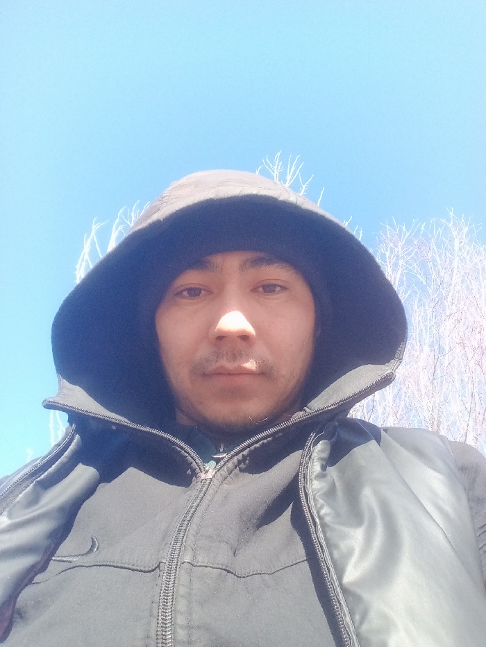 A male individual is depicted in an outdoor head-and-shoulders portrait, looking directly at the camera with a neutral expression. He wears a dark, possibly black, hooded jacket with the hood drawn over his head, revealing a dark beanie underneath. The jacket is partially unzipped, showing an internal garment and a faint, dark swoosh-like emblem on the left chest. The background features a clear, bright blue sky dominating the upper frame, with slender, light-colored bare tree branches visible on both sides of the subject's head. The lighting is consistent with bright daylight. The scene is located in the city of Chimbay, Uzbekistan.