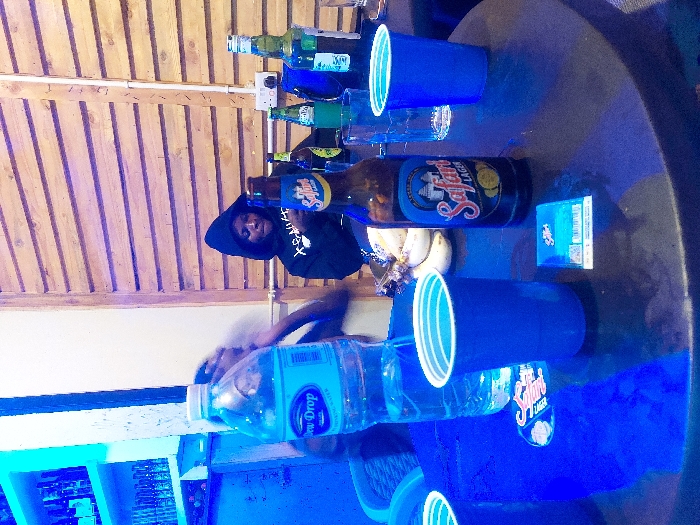 The image depicts an indoor social setting, likely a bar or lounge, under strong blue artificial lighting in Iringa, Tanzania