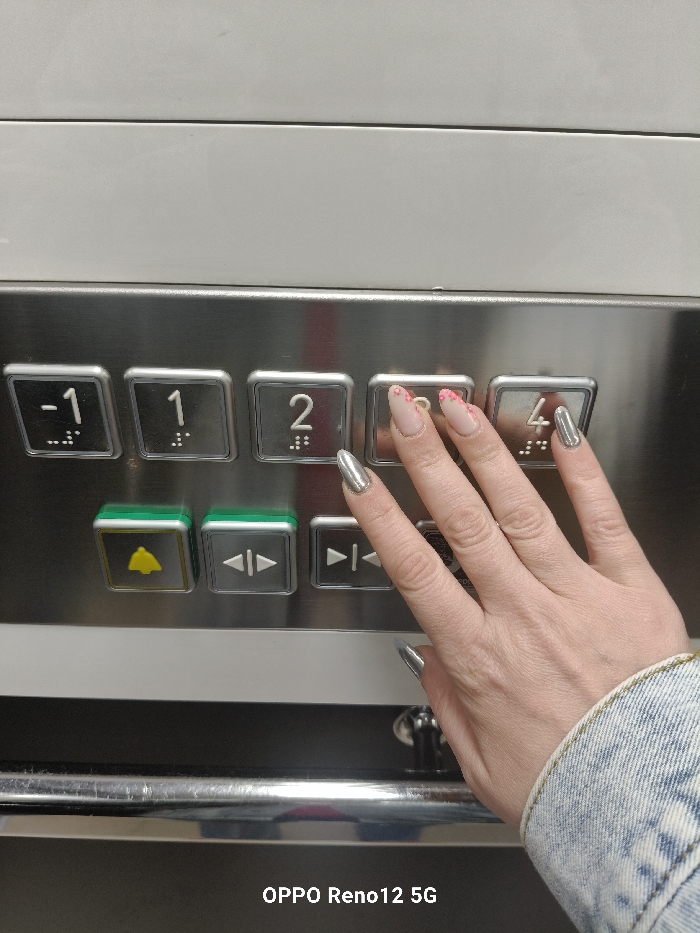 A close-up, eye-level photograph depicts a human hand interacting with a stainless steel elevator control panel within the city of Cuéllar, Spain. The control panel features two horizontal rows of square, metallic buttons. The upper row displays floor selection buttons labeled "-1", "1", "2", "3", and "4", each with corresponding Braille dots. The lower row contains three utility buttons: a green-bordered alarm bell button on the left, followed by a door-open button (two opposing arrows) and a door-close button (two converging arrows). A light-skinned adult hand is positioned with its fingers extending towards the floor buttons. The middle finger, adorned with a clear or light pink nail featuring small pink floral designs, hovers over or lightly presses the "3" button. The index, ring, and pinky fingers, along with the visible portion of the thumb, have a reflective metallic silver/chrome nail finish. The cuff of a light blue denim jacket is visible on the right side of the image, encompassing the subject's wrist. Below the control panel, a horizontal, reflective metal handrail is present. The background above the panel is a plain white surface, while the area below the handrail is dark.
