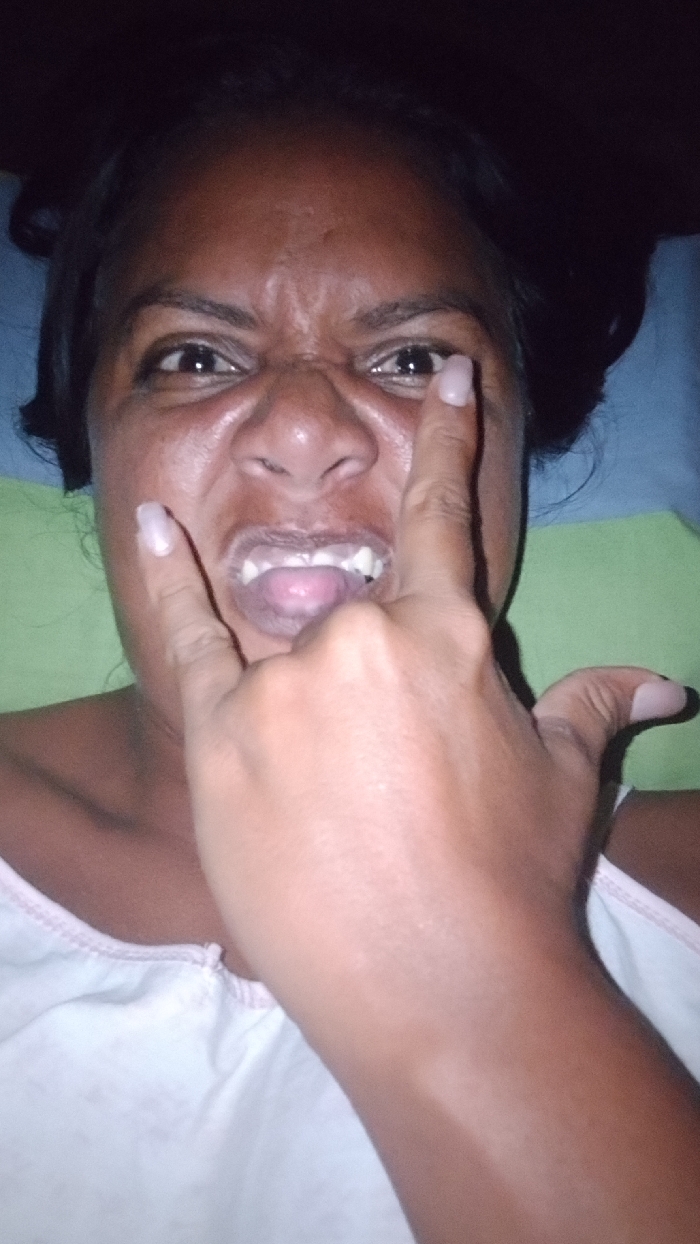 A dark-skinned woman lies on a green and blue surface, possibly a bed, staring into the camera with a scrunched face and bared teeth. She is making a hand gesture that resembles devil horns. Her hair is dark and pulled back. She wears a white tank top with pink trim. The lighting is dim. The overall expression is playful.