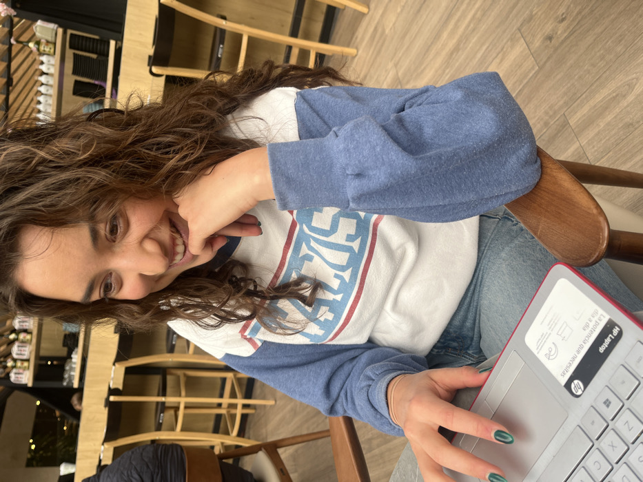 A smiling woman with long, curly brown hair is seated at a table. She wears a white long-sleeved shirt with blue sleeves and blue jeans. Her left hand is near her mouth, and her right hand rests on a silver HP laptop with a red trim. Her nails are painted green. The background includes a wooden floor, light-colored chairs, and shelves stocked with various items. A partial view of a person wearing a dark gray shirt is also visible.