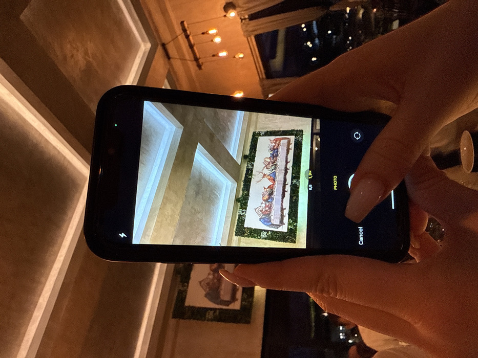 A pair of hands, with manicured, light pink fingernails, holds a black smartphone vertically, actively operating its camera function in "PHOTO" mode. The phone's screen displays a framed artwork on a wall: a whimsical parody of "The Last Supper" featuring anthropomorphic animal characters, notably a deer-like figure at the center, surrounded by artificial green foliage acting as the frame. Above the artwork, the phone's screen shows a segment of a light-colored, multi-tiered ceiling with recessed lighting. The surrounding environment, visible outside the phone's display, is a dimly lit restaurant interior. A similar framed artwork is partially visible on a wall to the left of the phone. The ceiling above features warm-toned, textured panels with illuminated white soffits. To the right, a multi-bulb chandelier with exposed Edison-style bulbs hangs from a wooden beam. A large window offers a panoramic night view of a city, identifiable by numerous scattered lights against the darkness, suggesting an elevated location. A blurred figure in a white shirt is partially visible to the far left. A small, dark cup rests on a table surface in the immediate foreground, beneath the phone. This scene is located at The View Sofia restaurant, situated in the Millennium Center, Sofia, Bulgaria.