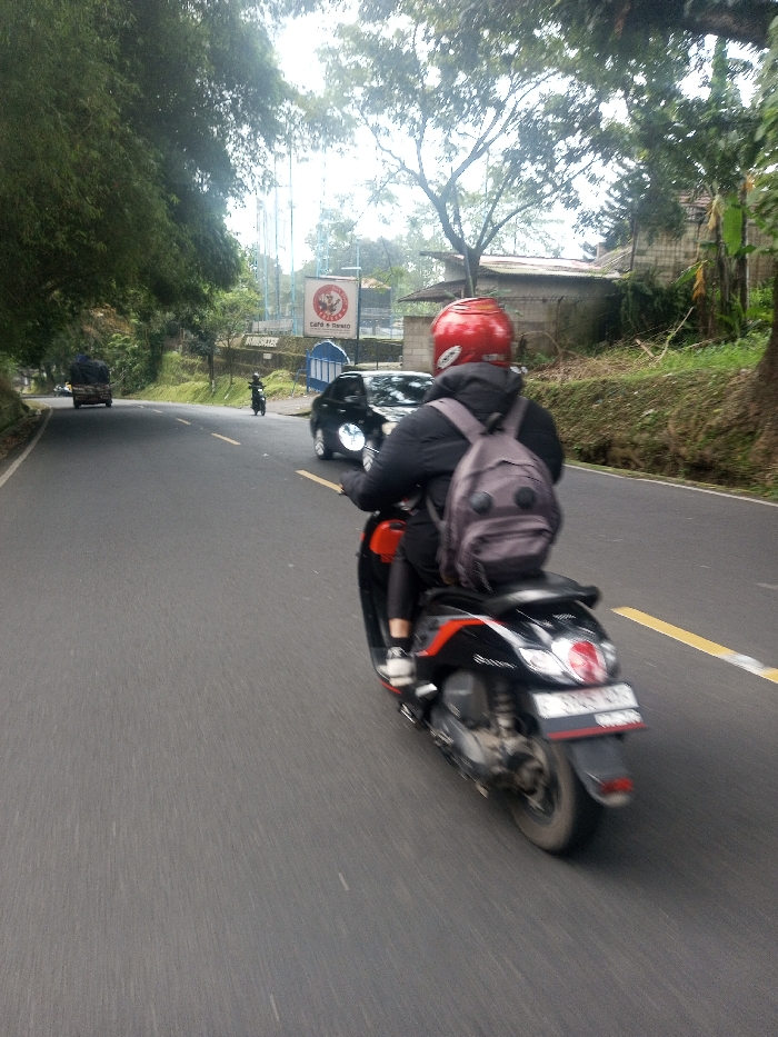 A person wearing a red helmet, a dark jacket, and a gray backpack is depicted riding a black and orange scooter with a blurred vehicle registration plate on an asphalt road in Niz Lakuk, India. The scooter is moving forward, with the rider's left foot visible in a white shoe. Ahead of the scooter, a black car and a smaller black motorcycle are also traveling in the same direction. Further down the road on the left, a covered truck is visible. The road features a broken yellow line on the right side. To the left, the road is bordered by dense green foliage. To the right, an embankment covered in greenery leads to a building with a corrugated metal roof. In the mid-ground, a sign with a red circular logo and the text "Cafe & Resto" is visible, with light blue structures behind it. The scene is illuminated by an overcast sky, casting diffused light.
