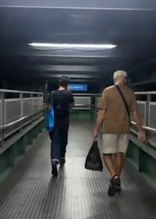 Two people, one younger and one older, are walking along a covered walkway or enclosed bridge. The younger person, wearing a black shirt and dark pants, walks slightly ahead and to the left. They carry a blue bag on their shoulder. The older person, wearing a tan shirt and light-colored shorts, follows behind and to the right. They carry a black shopping bag in their right hand. The walkway has metal flooring and is lined with metal railings. Overhead, there are fluorescent lights providing illumination. A sign overhead reads "San Pedrito." The setting appears to be a transportation hub or station.