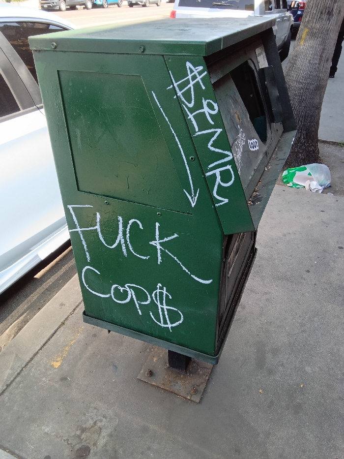 In East Los Angeles, United States, a dark green newspaper vending machine stands on a concrete sidewalk during daylight hours. The machine is bolted to the ground via a rusted metal base. White graffiti is visible on its exterior: "FUCK Cop$" is written on the lower left panel, and "$EMR" with a downward arrow is on the upper right angled panel. A "LOUD" sticker and other illegible markings are present inside the recessed dispenser area. To the left, a portion of a white vehicle is parked parallel to the sidewalk. To the right, a tree trunk with exposed roots is visible, and a crumpled white and green plastic bag lies on the concrete. The sidewalk displays minor stains and a yellow paint mark. Several other vehicles are discernible in the distant background, suggesting a street or parking area.