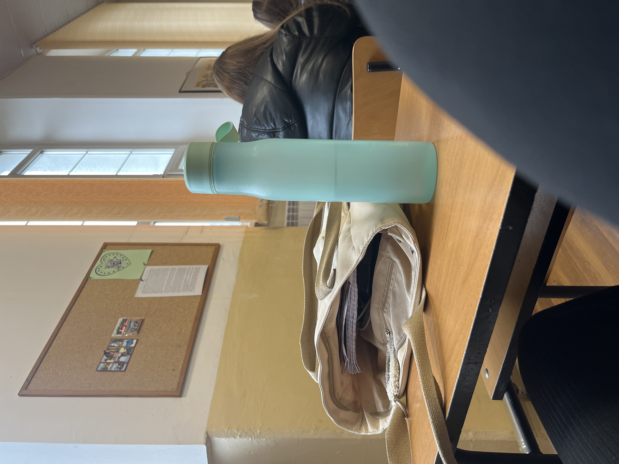 An eye-level shot within a classroom. A light-blue reusable water bottle rests horizontally on a wooden desk, next to a light-colored open tote bag. The tote bag's contents include notebooks and miscellaneous items. Behind the desk, a person wearing a black leather jacket is seated. A cork bulletin board hangs on the yellow wall. The bulletin board has attached papers, a green heart-shaped note, and multiple small photographs. The location is in a school classroom in Ruse, Bulgaria.