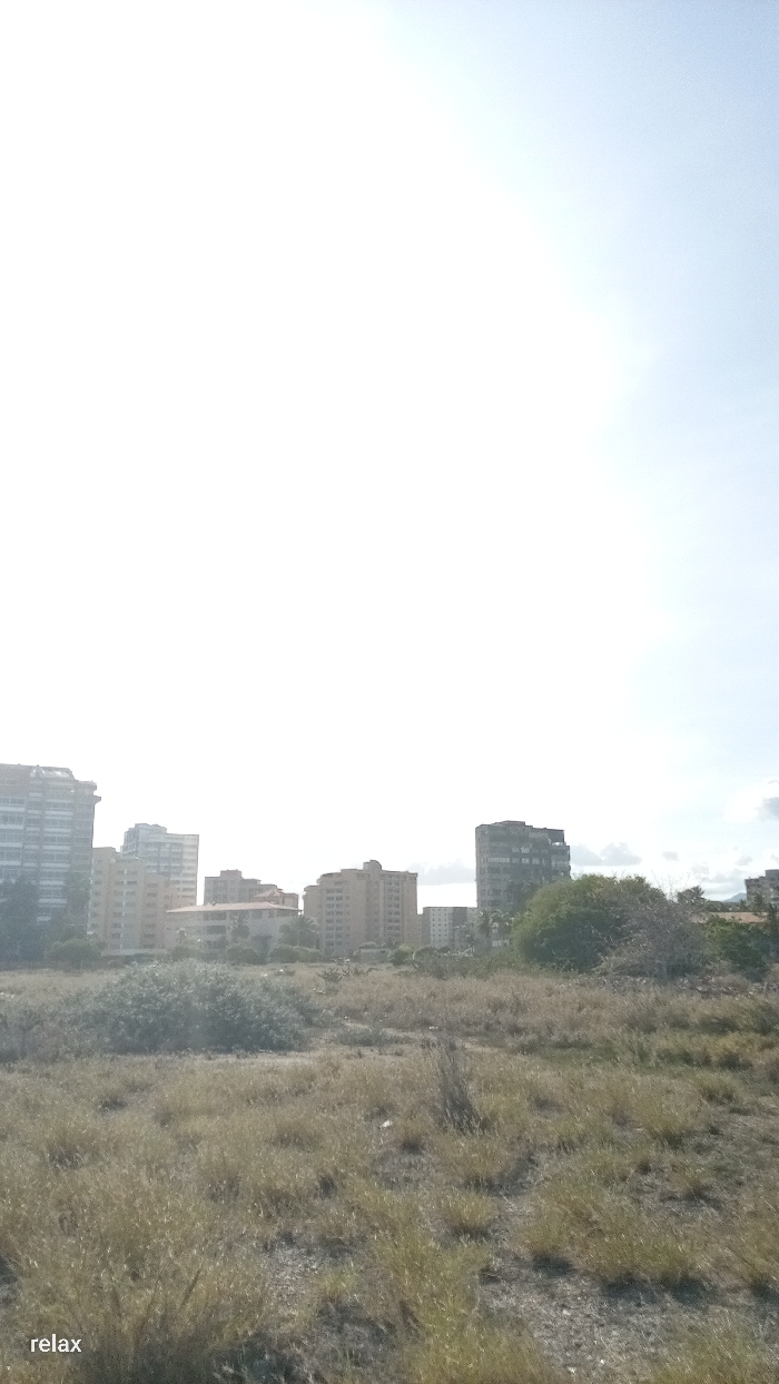 A sun-drenched vacant lot dominates the foreground, covered in dry, golden-brown grasses and sparse vegetation. In the background, a hazy cityscape emerges, featuring several mid-rise apartment buildings and residential structures. The sky is bright, nearly washed out, lending a sense of heat and stillness to the scene. "relax" is imprinted in the bottom left corner.