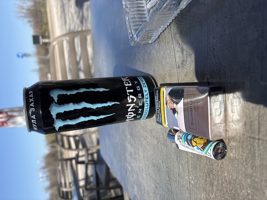 The scene depicts an arrangement of objects on a grey, textured outdoor table under direct sunlight, casting distinct shadows. A black Monster Energy "Absolutely Zero" can stands upright, displaying "НУЛА ЗАХАР" (Zero Sugar) in Cyrillic at its top. To its lower left, a colorful, patterned Zippo-style lighter rests next to a sealed brown Dunhill cigarette pack, which features a Bulgarian health warning overlaying an image of two individuals. To the lower right, a clear, faceted glass ashtray contains several cigarette butts. The background is blurred, showing unoccupied outdoor chairs, sparse trees, a clear blue sky, and distant road signs, consistent with an outdoor café environment in Bulgaria. A specific location within the city of Plovdiv, Bulgaria, cannot be determined from the visual evidence presented.
