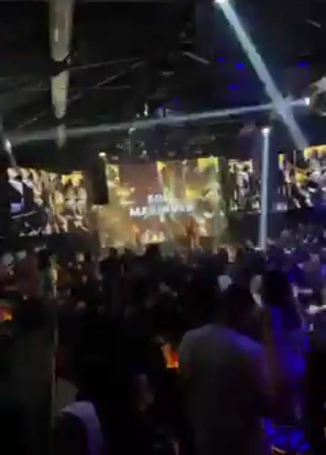 A crowded nightclub bustles with activity under a dynamic light show