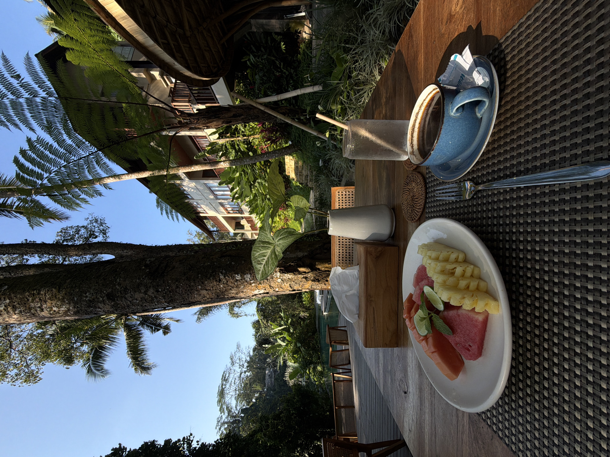 breakfast table set on a wooden deck, with a view of lush greenery and architecture in Kedewatan, Indonesia. A white plate holds sliced fruit - watermelon, pineapple, and papaya - garnished with lime and mint. A blue ceramic mug with a saucer contains coffee, accompanied by sugar packets. A glass of water with a straw is positioned next to a small, woven coaster. A tissue box rests near the plate of fruit. A fork lies on a woven placemat. The surrounding environment includes dense tropical foliage and partial views of buildings, suggesting a resort or residential area in a natural setting. The photo captures a well-lit outdoor scene, likely in the early morning.
