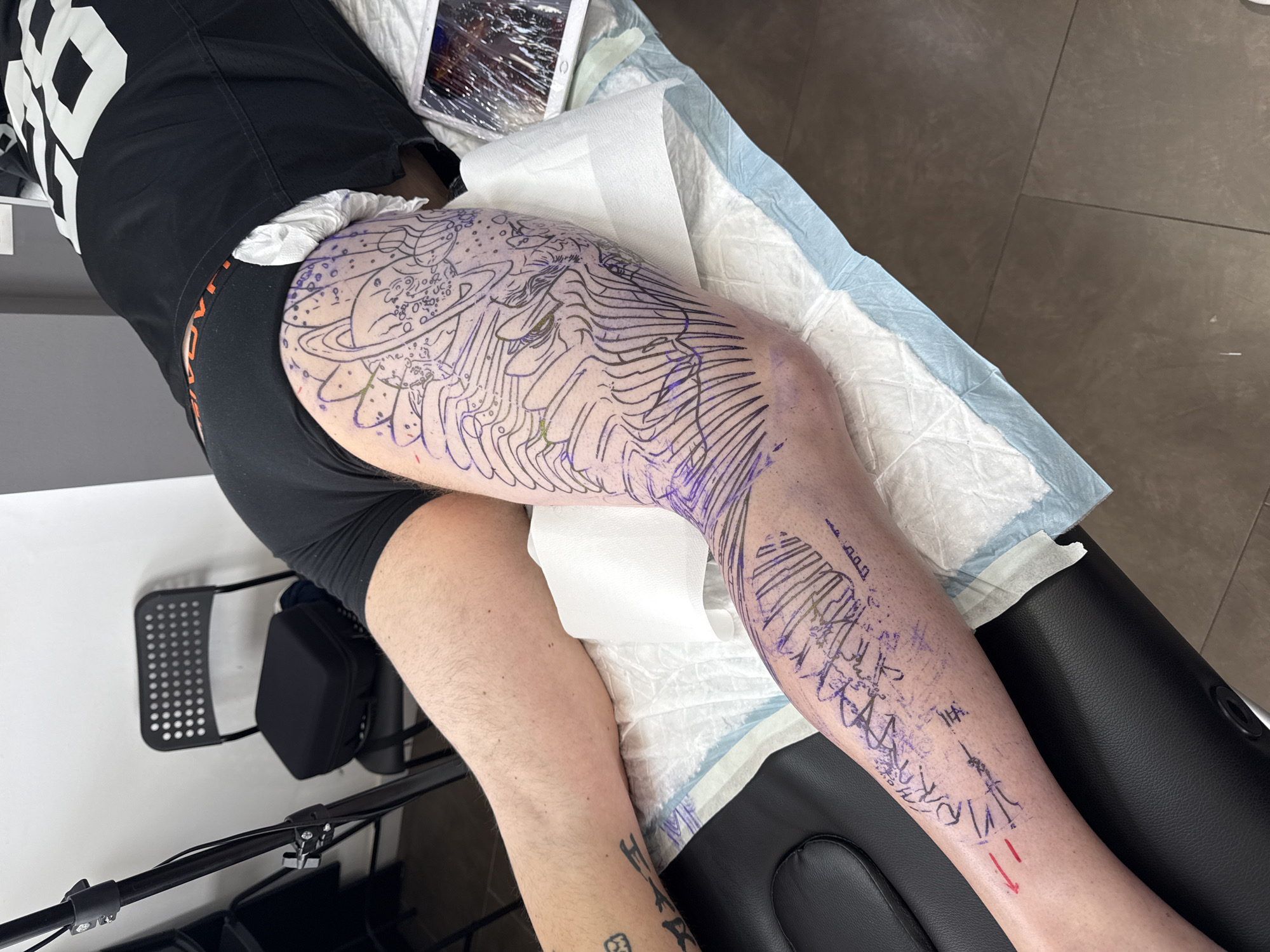 The image depicts an indoor scene within a tattoo studio located in Yaiza, Spain. A Caucasian individual is lying on their right side on a black padded tattoo bed, positioned for a leg tattoo session. They are wearing a black t-shirt with white text on the back, partially visible as "28," and black athletic shorts or underwear. The individual's left leg is exposed and entirely covered with intricate purple tattoo stencil markings, extending from the upper thigh down to the mid-calf. The stencil designs include abstract lines, organic shapes, and what appears to be a planetary or cosmic theme on the upper thigh, transitioning to more linear and angular patterns on the lower leg. Red arrows are marked on the lower leg, possibly indicating direction or placement. The leg rests on a disposable blue-bordered white medical pad. To the right of the individual's hip, a white digital tablet, possibly an iPad, is visible, wrapped in clear plastic film and displaying a colored image or reference material. A roll of white paper towels is also present nearby. In the background, a plain white wall is visible. Against this wall, a black metal chair with a perforated backrest stands, with a black rectangular carrying case resting on its seat. A black studio stand, possibly for lighting or equipment, is partially visible on the far left. The floor consists of large, dark brown or grey tiles. No other individuals are present in the frame, and no tattooing equipment is actively being used, indicating a pre-tattooing stage.