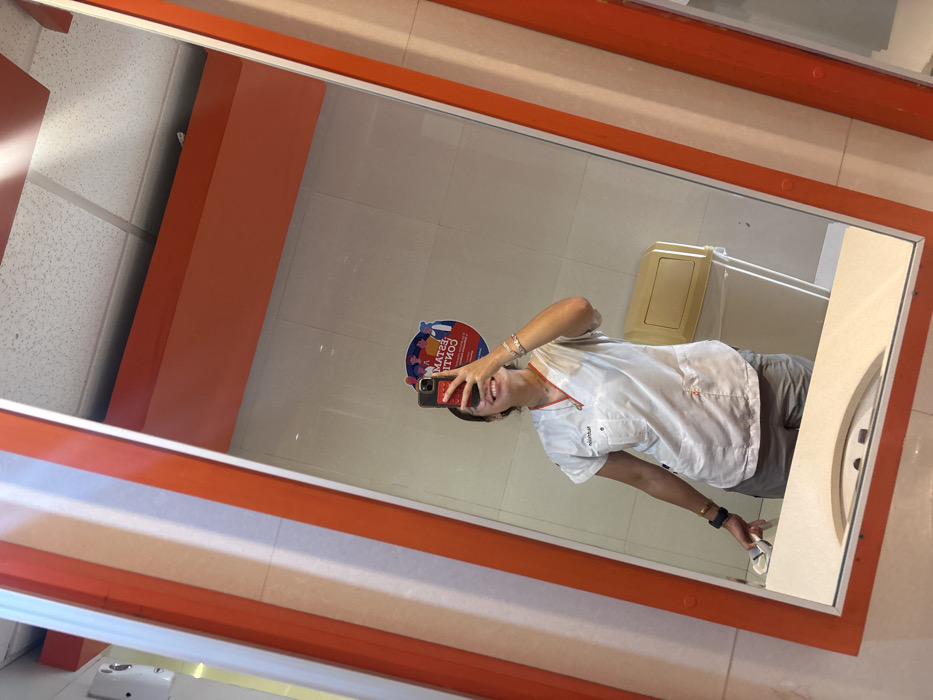 A person is depicted taking a mirror selfie in what appears to be a restroom or changing area within Chablekal, Mexico