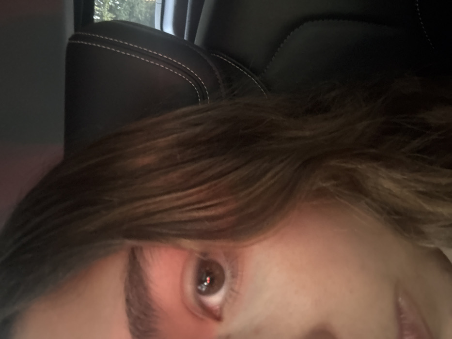 The image presents a close-up, angled view of a person's left facial profile and adjacent environment, captured inside a vehicle in Mexico City, Mexico. The central subject is the left side of a person's face, displaying a brown eye with a distinct red light reflection in the pupil, a natural eyebrow, and a portion of the nose and mouth. Long, wavy, brown hair frames the face and extends towards the right of the frame. A strong red-orange light source illuminates the left side of the face, creating a warm glow. To the right, a dark, possibly leather, car seat headrest with white contrasting stitching is visible. Through a rear window visible behind the headrest, faint green foliage can be discerned, indicating an outdoor setting during daylight or twilight. No specific actions or interactions are depicted beyond the person's presence within the vehicle.