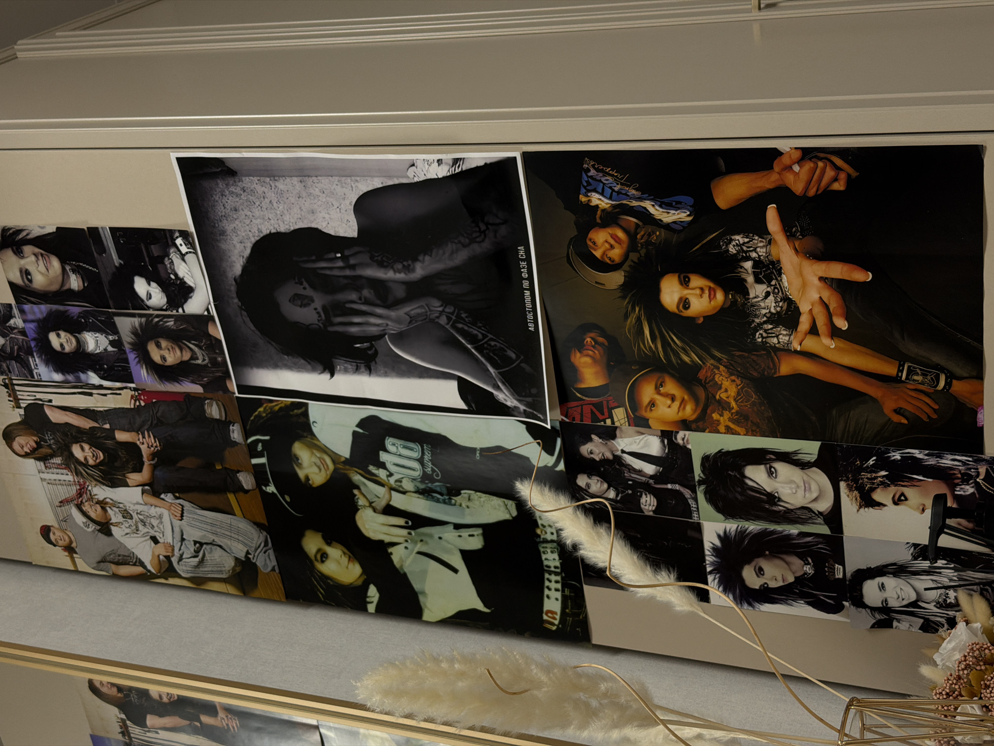 The image depicts a collage of posters affixed to a wall. The posters contain images of a band or musicians, possibly a rock band, with various black and white photographs of individuals, some in group settings. The photos feature individuals with stylized hairstyles and attire, suggestive of a gothic or alternative aesthetic. The posters are arranged in a slightly haphazard manner, with overlapping edges and varying orientations. In the foreground, there is a decorative arrangement featuring light-colored, feathery plant elements and a gold-colored geometric structure. The wall behind the posters is light-colored, possibly white or off-white, and there is a molding or trim visible along the top of the wall. The location in the city of Nizhnevartovsk, Russia is not discernible from the image.