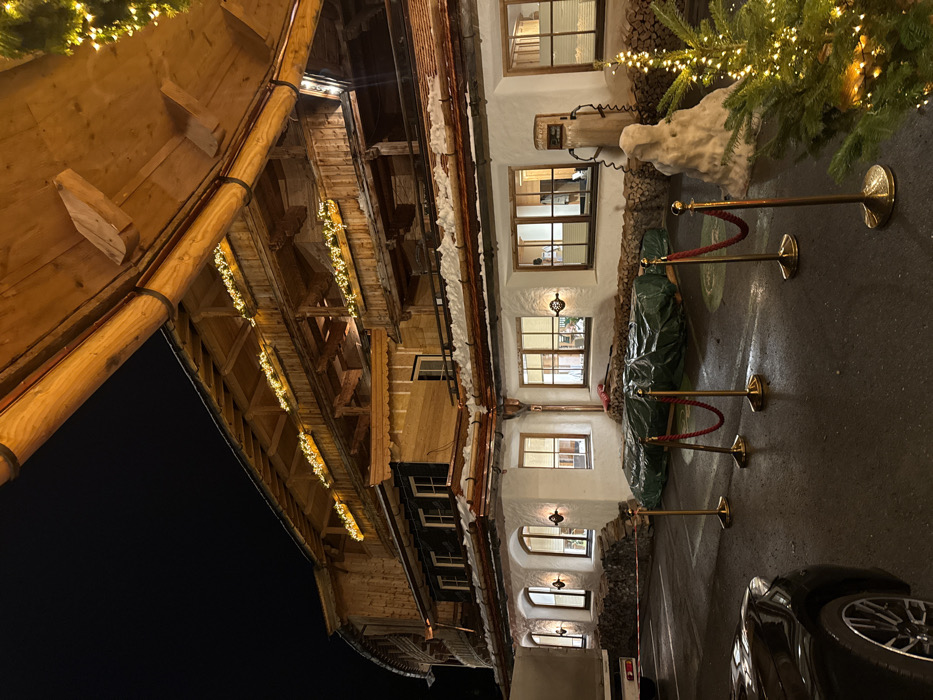 A vertically oriented photo showcases a building at night. The left side displays a wooden structure with lights strung along it, set against a dark sky. The building's right side, white with multiple windows, is partially bordered by snow. Roped gold stanchions divide the building from the parking area, where a black car is partially visible at the bottom. A small Christmas tree with lights stands near the stanchions.