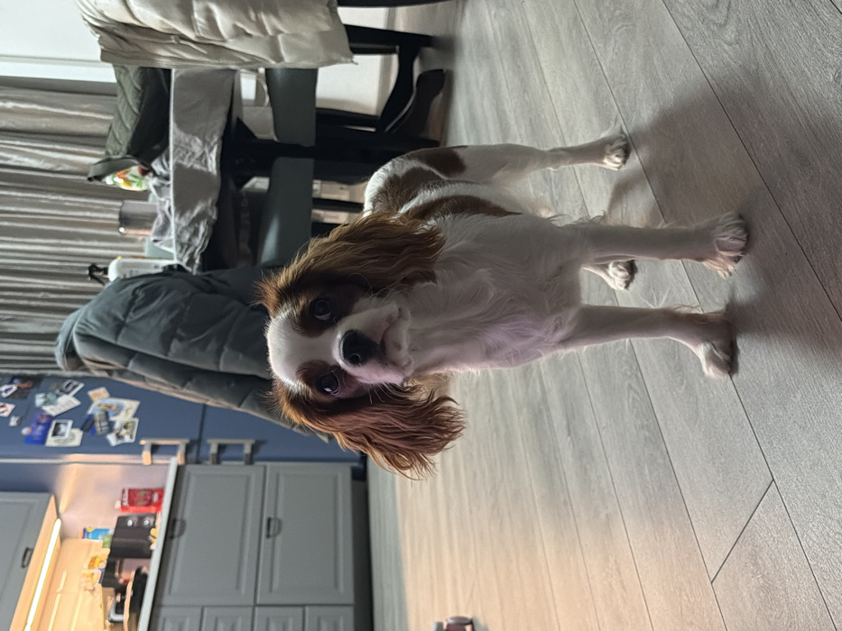 - "A Cavalier King Charles Spaniel stretches playfully on a light-colored wooden floor" by FM-wsVVs1, licensed under CC BY 4.0