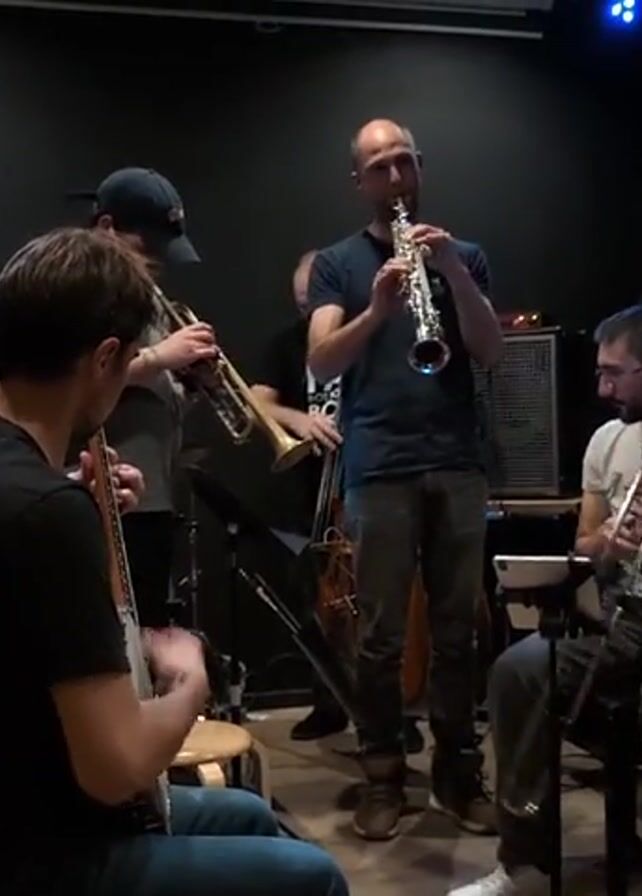 In a dimly lit room, five musicians are actively engaged in a jam session. On the left, a bearded man with long hair tied back plays an electric guitar while seated. Next to him, another seated musician plays a bass guitar. A third man, wearing a baseball cap, stands and plays a trumpet. To his right, a bald man also stands and plays a saxophone. Seated on a stool to the right is a fifth man with glasses who plays a trombone. In the background, a black grand piano can be seen, along with an amplifier, stands, and other music-related equipment. A houseplant sits next to the piano. The walls of the room are dark, and there is a single blue light shining from above.