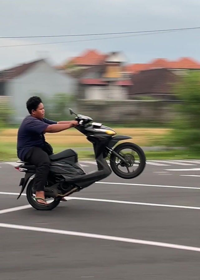 young person riding a black scooter on a paved road with white lane markings. The person, wearing a dark blue shirt, dark pants, and flip-flops, is performing a wheelie, with the front wheel raised off the ground. The background includes greenery, palm trees, buildings, and a cloudy sky. After a short distance, the rider brings the front wheel down and continues driving on the road.