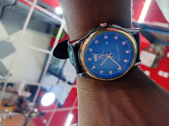 A close-up, high-angle image captures a dark-skinned forearm and wrist adorned with a Rolex Oyster Perpetual wristwatch, situated in Dorayi, Nigeria