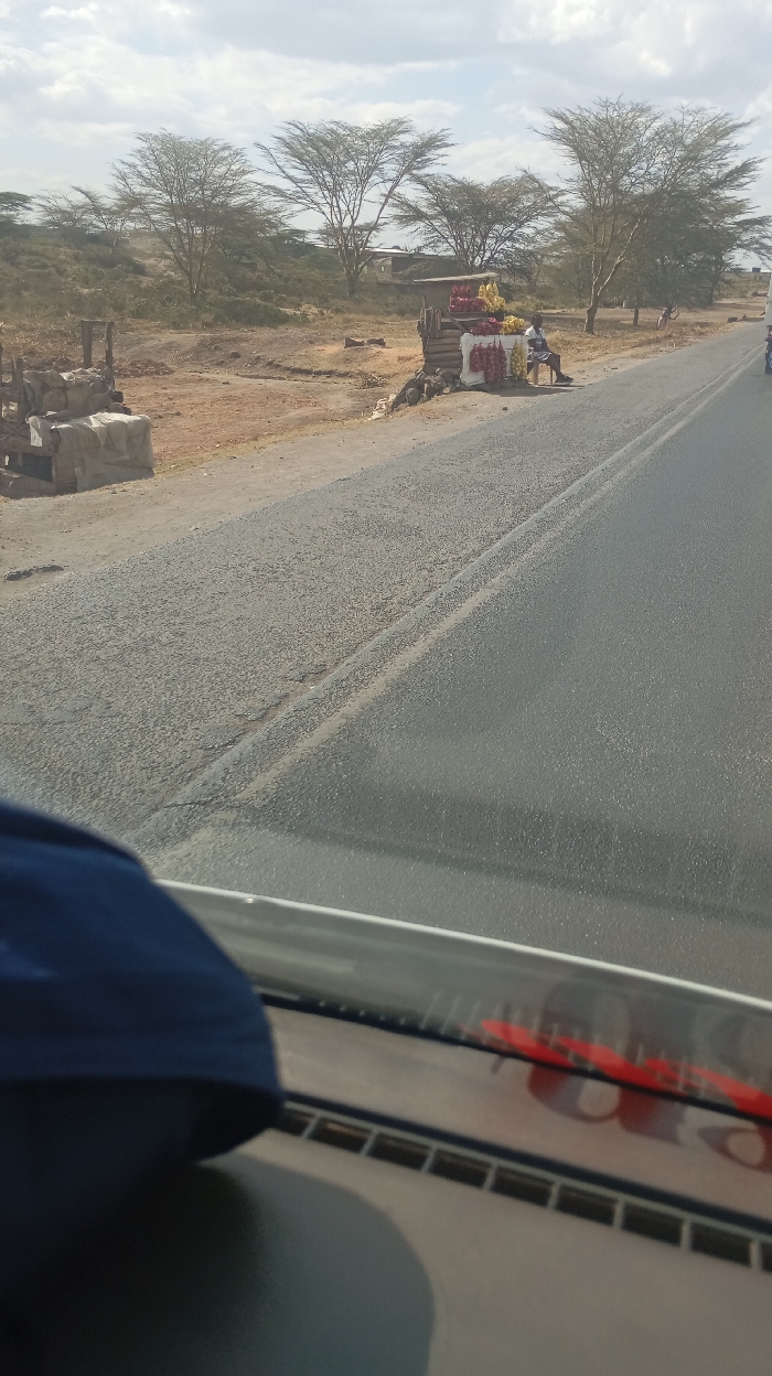 A roadside fruit stand with a man sitting nearby. The stand displays colorful fruits and vegetables. Behind the stand, the landscape features sparse, bare trees, suggesting a dry climate. A paved road runs in front of the stand, seen from the perspective of a vehicle's dashboard. The dashboard includes a blue object and partially visible red writing. The scene suggests a rural or developing area.