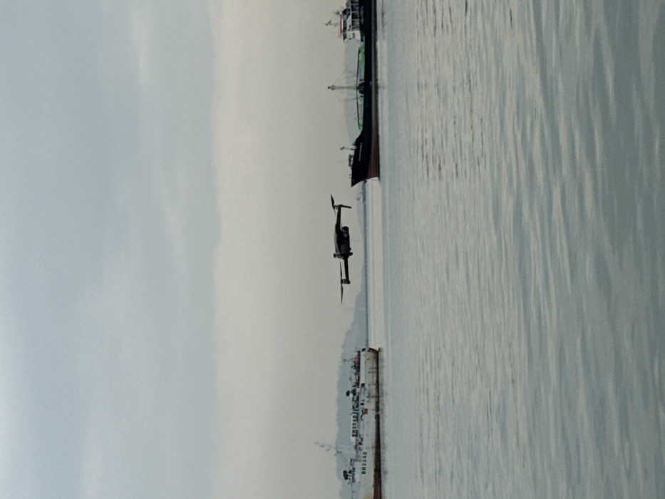 The image depicts a drone hovering over water with ships docked in the background. The sky is overcast, and the water reflects the ambient light. One of the ships displays the text "BMB3340".