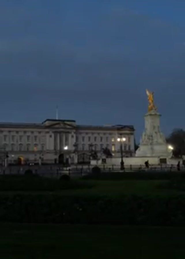 Buckingham Palace at dusk. The sky is a deep blue with some faint clouds. The Palace is a large, imposing building with many windows and classical architectural details. In front of the Palace is a large green lawn, and beyond that, a monument topped with a golden statue of a winged figure. A few people can be seen walking around the monument. The scene is dimly lit, with streetlights and the lights of the Palace providing some illumination. A white car drives past the scene.