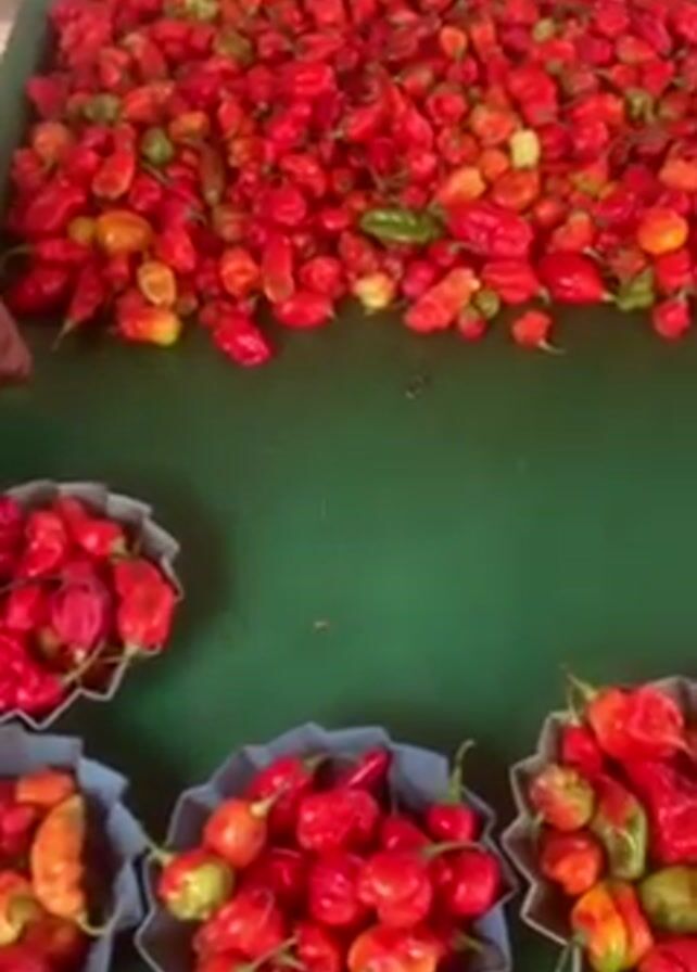 The video depicts a market stall laden with fresh produce. Red and orange peppers, some still green, are piled in a large heap on a green surface, with several small piles of peppers arranged in foil cups. To the right of the peppers are piles of red tomatoes, also arranged in foil cups. A person is briefly seen in the background, standing behind the stall. The stall is located outdoors, evidenced by a gray concrete wall and fence post visible in the background.