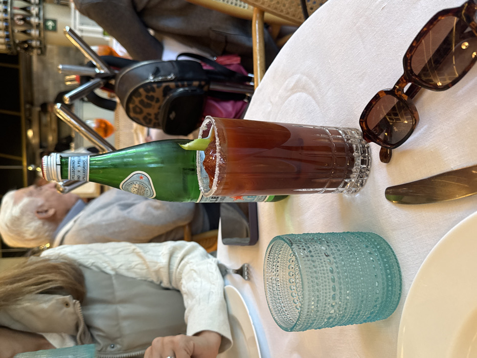 The image presents an indoor dining scene within an upscale restaurant, identified as Rosetta in the Roma Norte neighborhood of Mexico City, Mexico. The foreground features a table covered with a white tablecloth. Prominently centered is a tall glass containing a dark red beverage, likely a Michelada or Bloody Mary, distinguished by a salted rim and a small green garnish, possibly a serrano pepper or lime wedge. To its left, a green glass bottle of San Pellegrino sparkling water stands. A textured, teal-colored glass is positioned in the lower-left, adjacent to a partial white plate, a silver fork, and a silver knife. A pair of tortoiseshell-patterned sunglasses and a black smartphone (face down) rest on the tablecloth. On the left, a person's left arm, wearing a light-colored, possibly quilted, long-sleeved top and a ring on their finger, is visible near the plate. In the mid-ground, an older man with white hair, wearing a light grey sweater over a blue collared shirt, is seated in profile, facing right. A small black backpack with a leopard print flap hangs from a chair or stand in the background. The restaurant environment includes additional tables draped in white, wicker-style chairs, and blurred figures of other patrons. Orange-colored drinks, consistent with Aperol Spritzes, are visible on adjacent tables. Metallic fixtures and a glimpse of a kitchen or service area are discernible in the soft-focus background.