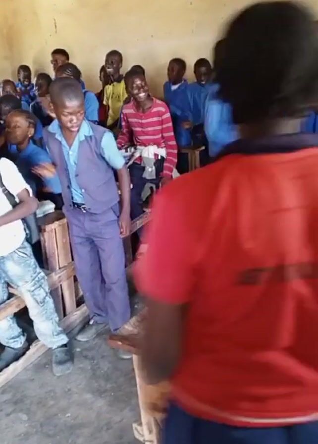 group of school children, mostly boys, in a classroom. The room is sparsely furnished with old, wooden desks and benches. The walls are painted a dull yellow. Most of the students are wearing blue school uniforms, though some wear red or white tops. The students are moving around and appear excited or energetic. One student falls over a desk. A person wearing a red shirt and blue skirt walks through the room, appearing to be a teacher or staff member. There is music or chanting in the background.