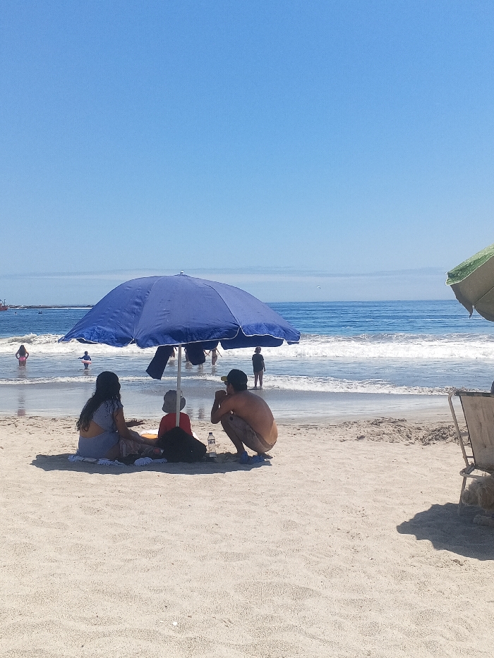 - "A family of three sits beneath a blue umbrella on a sandy beach" by FM-pGTMm2, licensed under CC BY 4.0