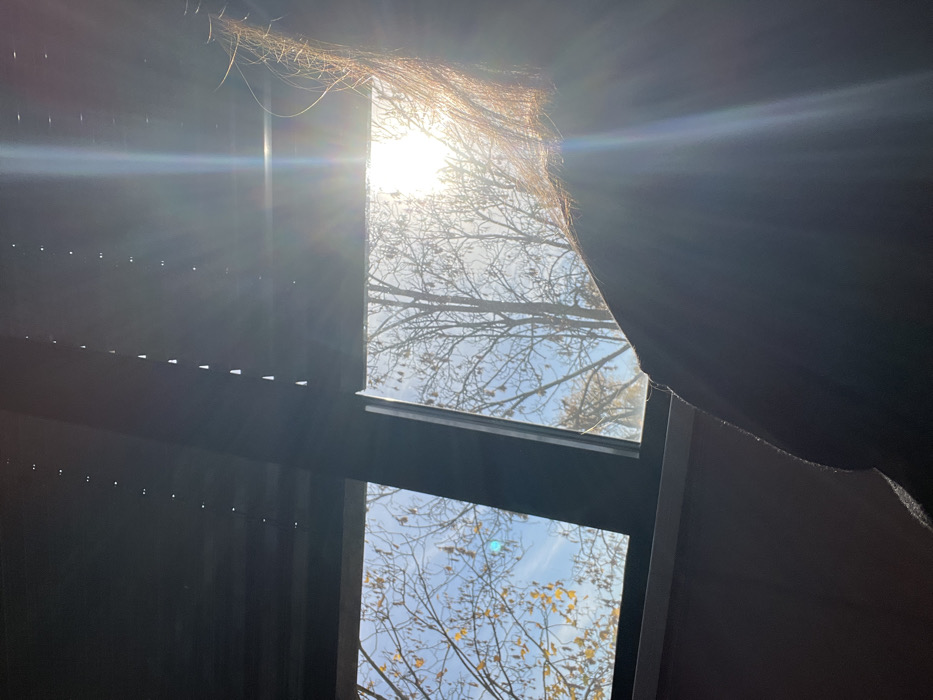The image, captured in Oberhausbergen, France, depicts an indoor scene looking outwards through a window on a sunny day. The upper portion of the image features a dark overhead structure, possibly a partially lowered blind or ceiling, through which small points of light are visible. Below this, a window with dark framing divides the external view. Outside, a clear blue sky is visible, along with multiple deciduous trees displaying largely bare branches, some retaining yellow foliage, indicative of autumn or early winter. Intense, direct sunlight emanates from the right side of the window, causing significant lens flare across the image. In the lower right quadrant, the silhouetted head and upper back of a person, viewed from behind, are present. The individual possesses reddish-brown hair, which is brightly backlit by the direct sunlight, highlighting individual strands. The lower left foreground consists of a dark, undifferentiated interior surface.