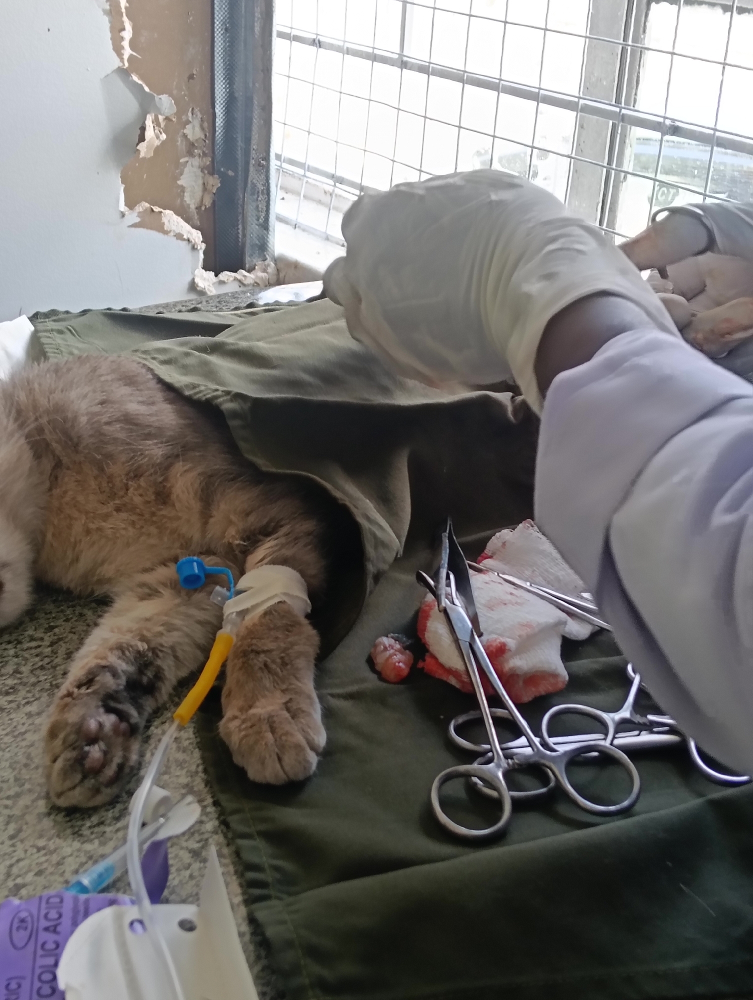 A veterinary surgical procedure is underway on a cat in a room in Nairobi, Kenya. The animal, a light brown tabby, is partially covered with a green surgical drape. A blue IV port and yellow tubing are visible on its left foreleg. A hand wearing a white surgical glove is holding an unidentified instrument, likely performing the procedure. To the right of the cat are several stainless steel surgical instruments, including hemostats and gauze pads with blood on them, along with a small lump of removed tissue, possibly a tumor. A partially visible bottle labeled "FOLIC ACID" is near the cat's foreleg. The background includes a window with metal bars and peeling paint on the wall.