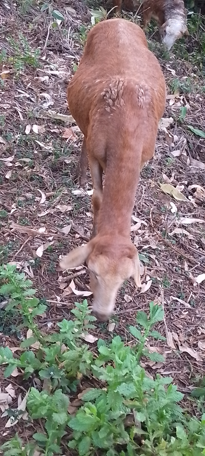 - "A reddish-brown goat grazes among fallen leaves and green plants" by FM-IqF5p1, licensed under CC BY 4.0