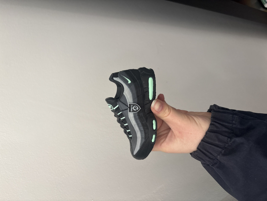 A fair-skinned human hand, clad in a dark, elasticated cuff garment, holds a miniature Nike Air Max 95 sneaker, presenting its left profile against a plain, light grey wall