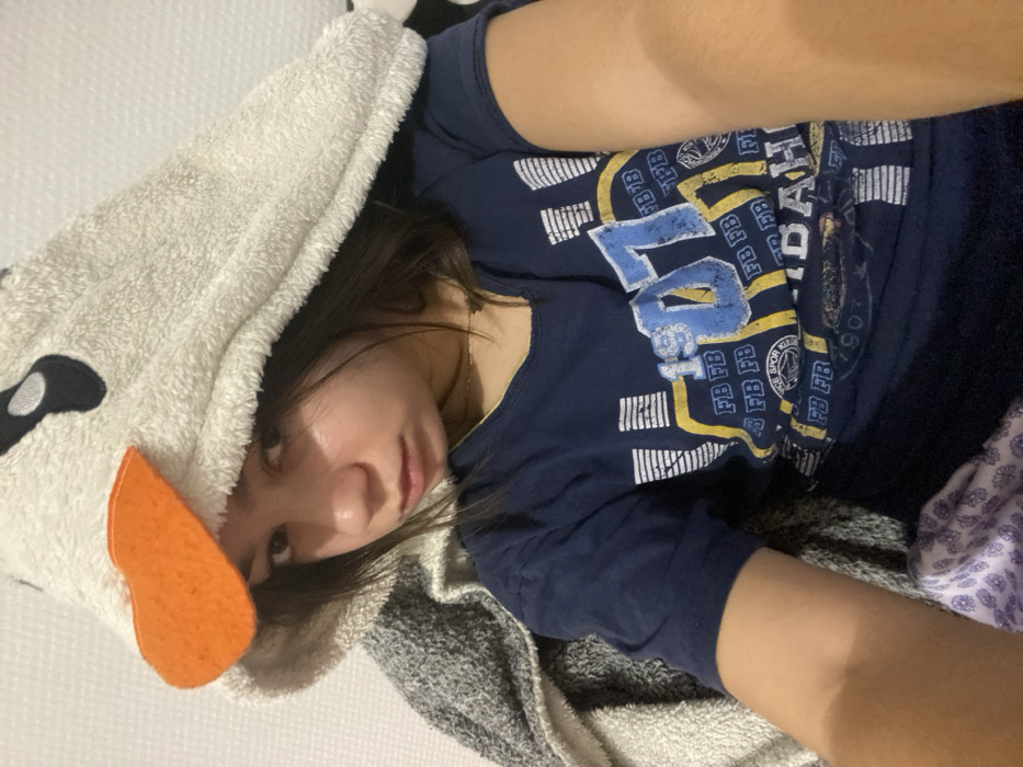 An indoor close-up depicts a young female in Bouxwiller, France, gazing directly with a neutral expression. She wears a white, plush hooded garment designed as a swan or duck, featuring an orange beak and black-and-white eyes. Underneath, she has a navy blue t-shirt with a distressed graphic design including the numbers '1907,' repeated 'FB' motifs, and additional text in yellow and white. A thin, gold-colored necklace is visible around her neck. Purple patterned sleepwear is seen on her lower body. A grey, textured blanket is draped over her left shoulder and arm. The background consists of a light-colored, subtly textured wall. The image appears to be a self-portrait.