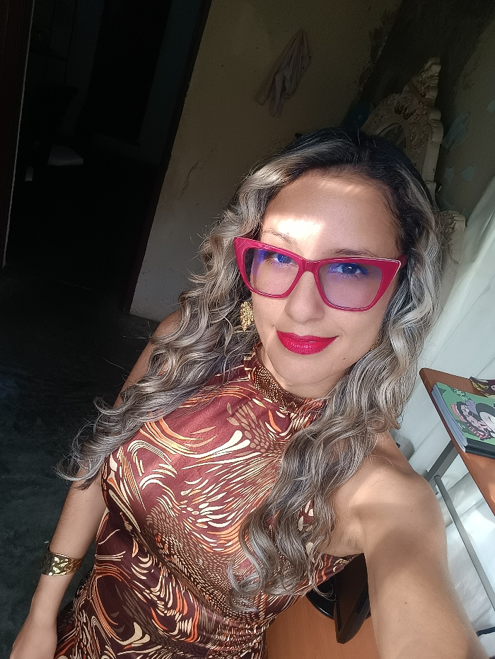 A female individual is depicted in an indoor selfie, identified as being in the city of Las Tejerías, Venezuela. The subject, a woman with long, wavy, multi-toned hair featuring blonde/grey highlights, faces the camera with a direct gaze and a slight smile. She wears prominent pink, cat-eye style eyeglasses, reflecting a blue light filter, and bright red lipstick. Her attire consists of a sleeveless, high-neck dress patterned in shades of brown, white, and orange. A gold-colored cuff bracelet is visible on her left wrist (viewer's right), and a gold-colored earring is on her right ear (viewer's left). Natural light illuminates the right side of her face and forehead, creating a distinct highlight. The background is an interior space with a light-colored wall. A dark doorway or hallway is visible to the left. On the right wall, a light-colored fabric item is draped, and an ornate, decorative piece, possibly a sculpture fragment, is affixed below it. A partial view of a table or surface with stacked items, likely books or magazines, is visible at the far right.