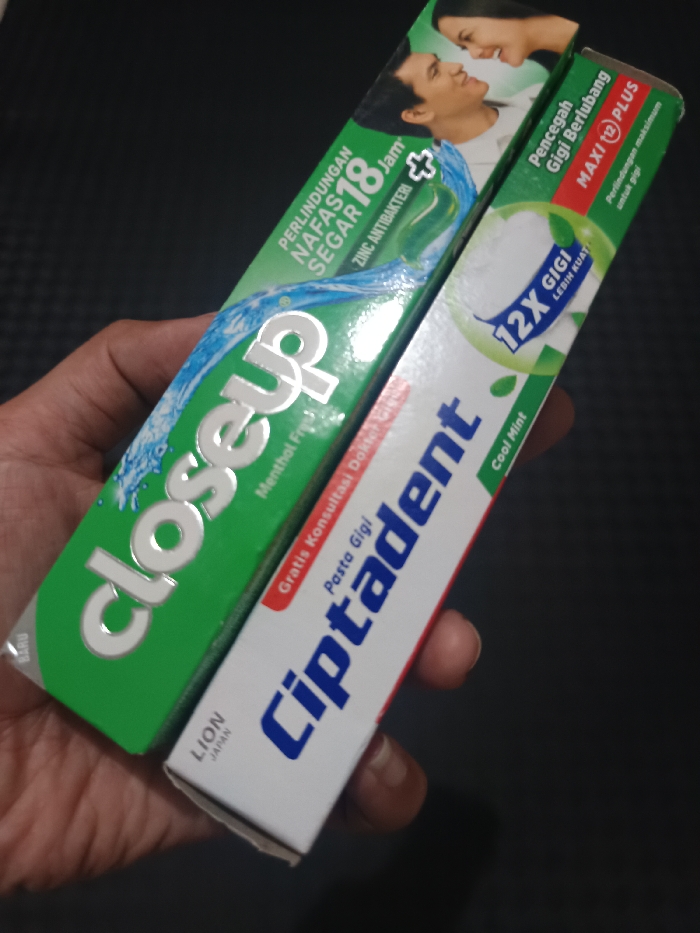- "A human hand with medium-dark skin holds two distinct toothpaste boxes diagonally against a dark, uniform background" by FM-WRTkH2, licensed under CC BY 4.0