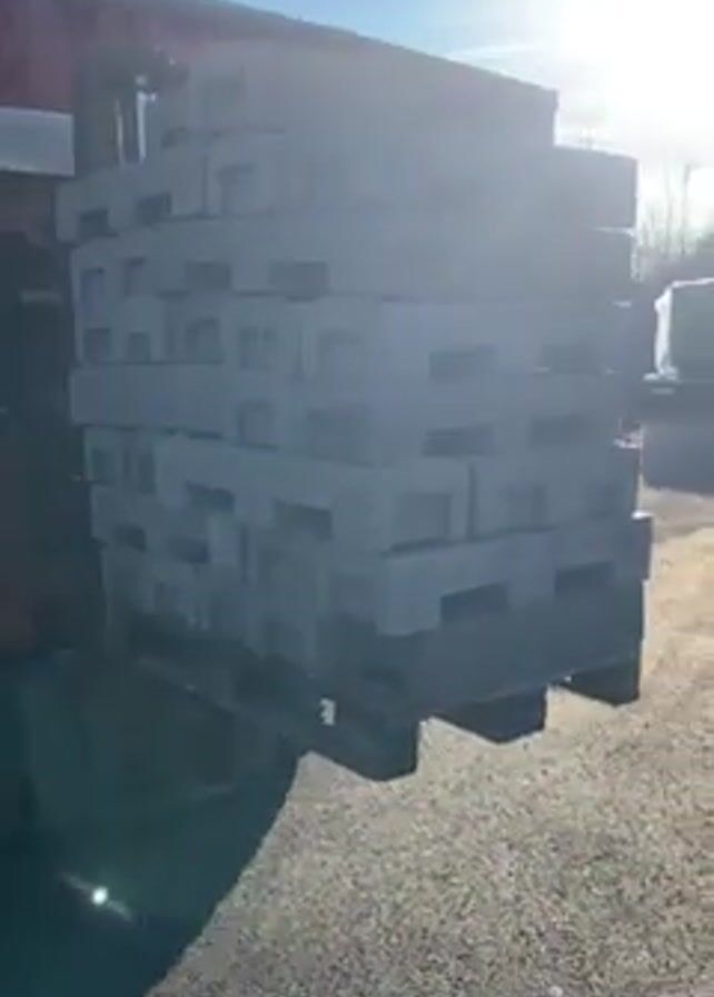 red forklift carrying a pallet loaded with gray, square concrete blocks. The forklift moves across a gravelly surface on a sunny day. A person is operating the forklift. In the background, a red semi-truck and a building can be seen. The sun shines brightly, creating glare and obscuring details in some parts of the video.
