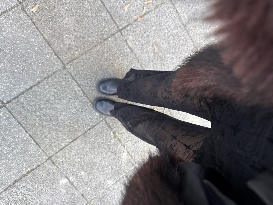 The image displays a downward, first-person perspective, focusing on a person's lower body and feet while standing outdoors. The individual is wearing dark, likely black, pants made from a semi-sheer fabric featuring repeating patterns of crosses and intricate filigree designs. Black, rounded-toe shoes with visible soles are worn on the feet. Portions of a dark brown or reddish-brown fur-trimmed garment are visible at the left and right edges of the frame, partially obscuring the upper legs. The ground is a light grey concrete paver sidewalk, composed of rectangular or square sections. Several scattered light brown dried leaves are present on the sidewalk surface. The broader geographical context is Berlin, Germany; however, no specific landmarks or identifying features are present to determine an exact location within the city.